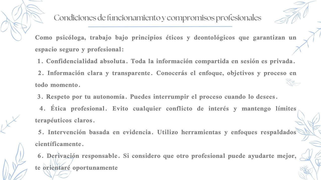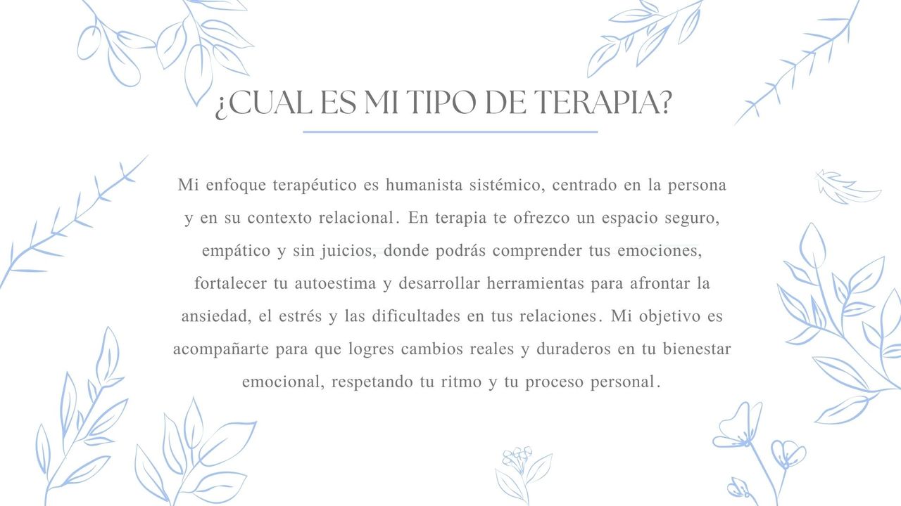 Mi propósito es ofrecerte un espacio cálido, empático y seguro, donde puedas hablar sin juicios, comprender lo que te sucede y transformar tu vida desde el amor propio y la conciencia emocional.