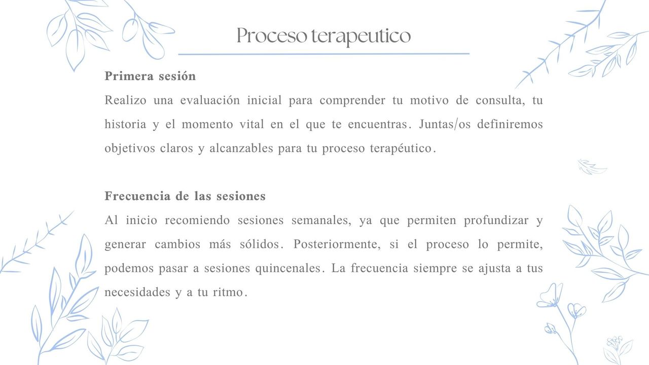 Adultos: en ansiedad, amor propio, relaciones de pareja, duelos, autoconocimiento, estrés laboral, toma de decisiones, dependencia emocional y crecimiento personal.