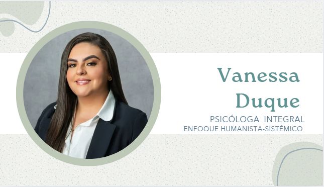 Soy Vanessa Duque, Psicóloga integrativa con enfoque humanista y sistémico. Acompaño a personas que buscan equilibrio emocional, sanar heridas del pasado y reencontrarse con su bienestar interior.